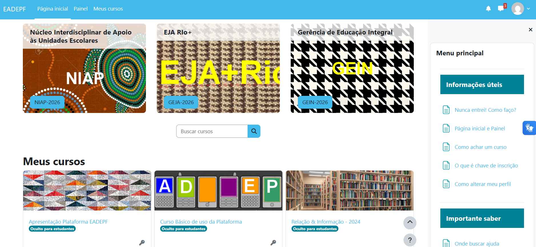 Escolhendo a Página inicial do site, você pode pesquisar por um curso, ou mesmo visualizar todos os cursos disponíveis no ambiente. Observe os ícones.
